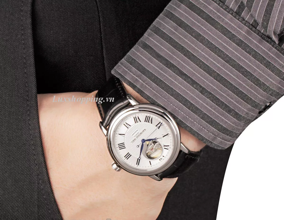 Hãy chú ý đến chiếc đồng hồ RAYMOND WEIL được chế tác tinh xảo này.
