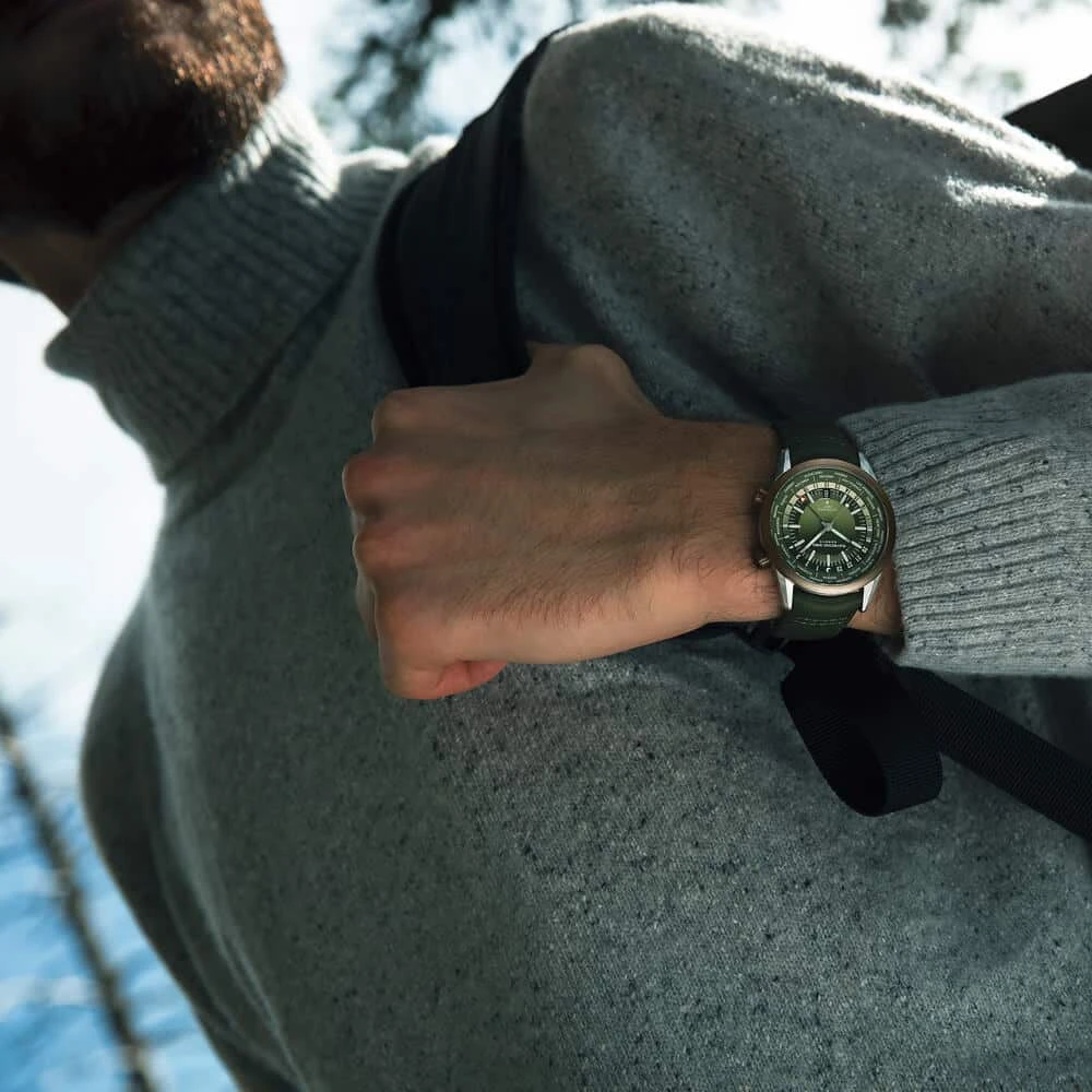Đồng hồ cũng được trang bị dây đeo da bê mềm mại, với phiên bản xanh lá có hoa văn tự nhiên và phiên bản đen có hoa văn cá sấu dập nổi. Dây đeo thuôn từ 21mm xuống 18mm, tạo ra sự cân đối hoàn hảo với thiết kế tổng thể của đồng hồ.